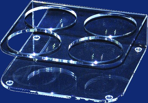 €41.00 VAT excludedVassoietto in plexyglass trasparente per quattro bicchieri con piedini antiscivolo. PREGO SPECIFICARE QUALE DEI DUE MODELLI: mod. 1 dimesioni: 19×18.5 cm diametro fori 7 cm mod. 2 dimensioni: 20.5×21.5cm diametro fori 9 cm